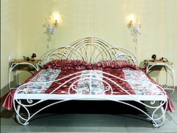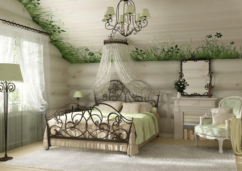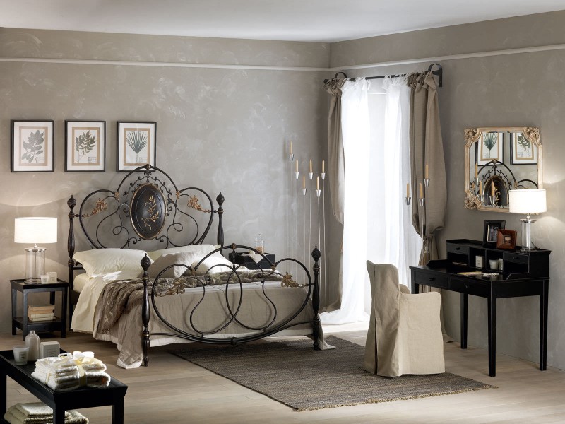 В спальне можно поставить кованую кровать с полупрозрачным балдахином. Добавят романтики кованые рамы для зеркал и настенные светильники. Для разделения зон можно установить ажурную кованую ширму. Витиеватый рисунок мебели придаст роскошь и изысканную эстетику.